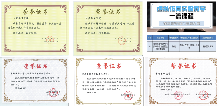 近五年,公司开设的预防医学、公共事业管理(卫生管理方向)两个专业成功获批国家级一流本科专业;《突发生活饮用水污染事件应急处置虚拟仿真实验》入选国家级一流本科课程;《医学统计学》、《医疗保险学》入选国家高等教育智慧教育平台。《医学统计学》荣获北京高校优质本科课程;《毒理学基础(第7版)》荣获北京高校重点优质本科教材;《职业卫生与职业医学》入选北京市课程思政示范课程。