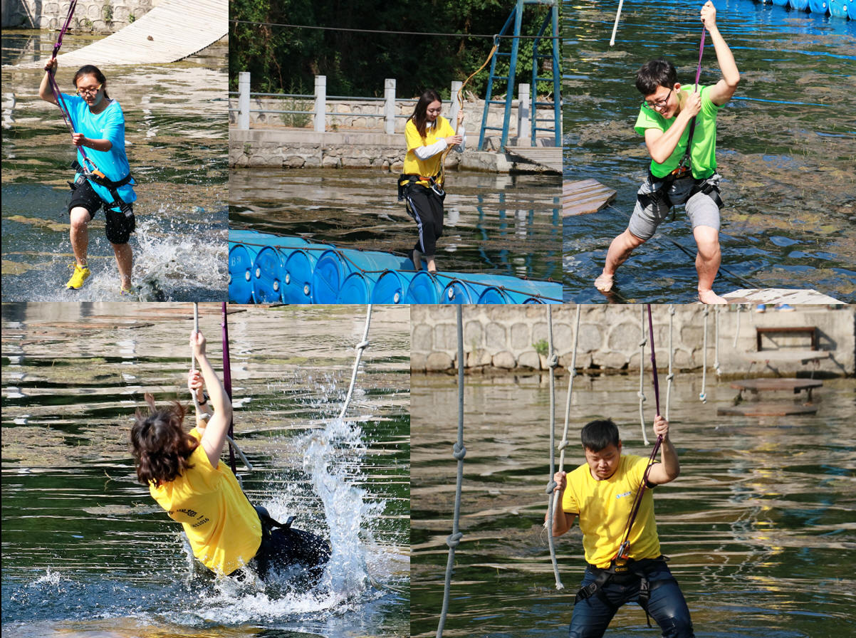 下午先进行了“罗马炮架”的搭建,各队通过提供的道具在限定时间内搭建出可以发射“炮弹”的炮架,然后进行远度、精度和攻防战的比拼,充分激发了大家的想象力和创造力,通过合作各队设计制作了造型各异的炮架,“水气球炮弹”为炎炎夏日带来了清凉。最后一个项目“水上挑战”是对个人的心理素质、自我挑战精神和团队力量的考验,三队分别进行,“水上浮筒”、“水上漂”、“水上板桥”三项挑战。虽然烈日暴晒,绳索勒得手酸疼,脚下一滑就不慎落水,但每个同学都努力克服恐惧,挑战自己,为全队顺利完成任务拼尽全力。