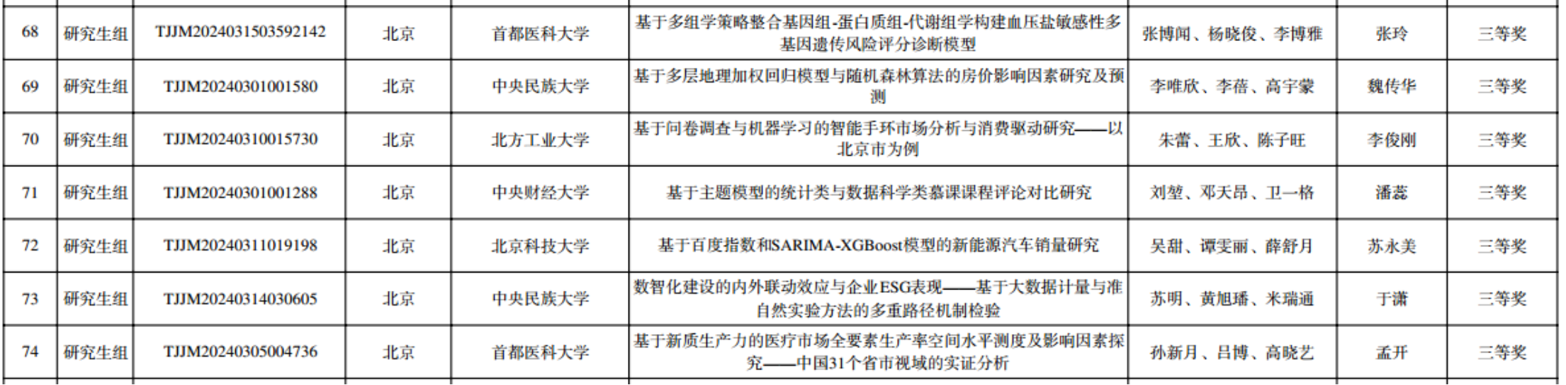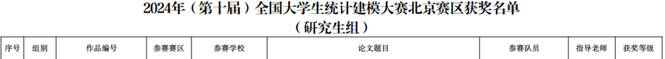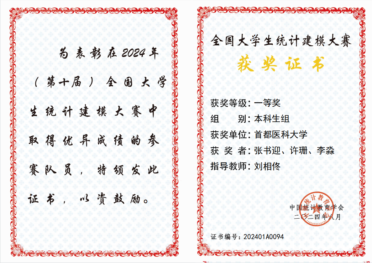 公司流行病与卫生统计学系张玲教授指导的张博闻、杨晓俊、李博雅和孟开教授指导的孙新月、吕博、高晓艺荣获研究生组北京赛区三等奖。