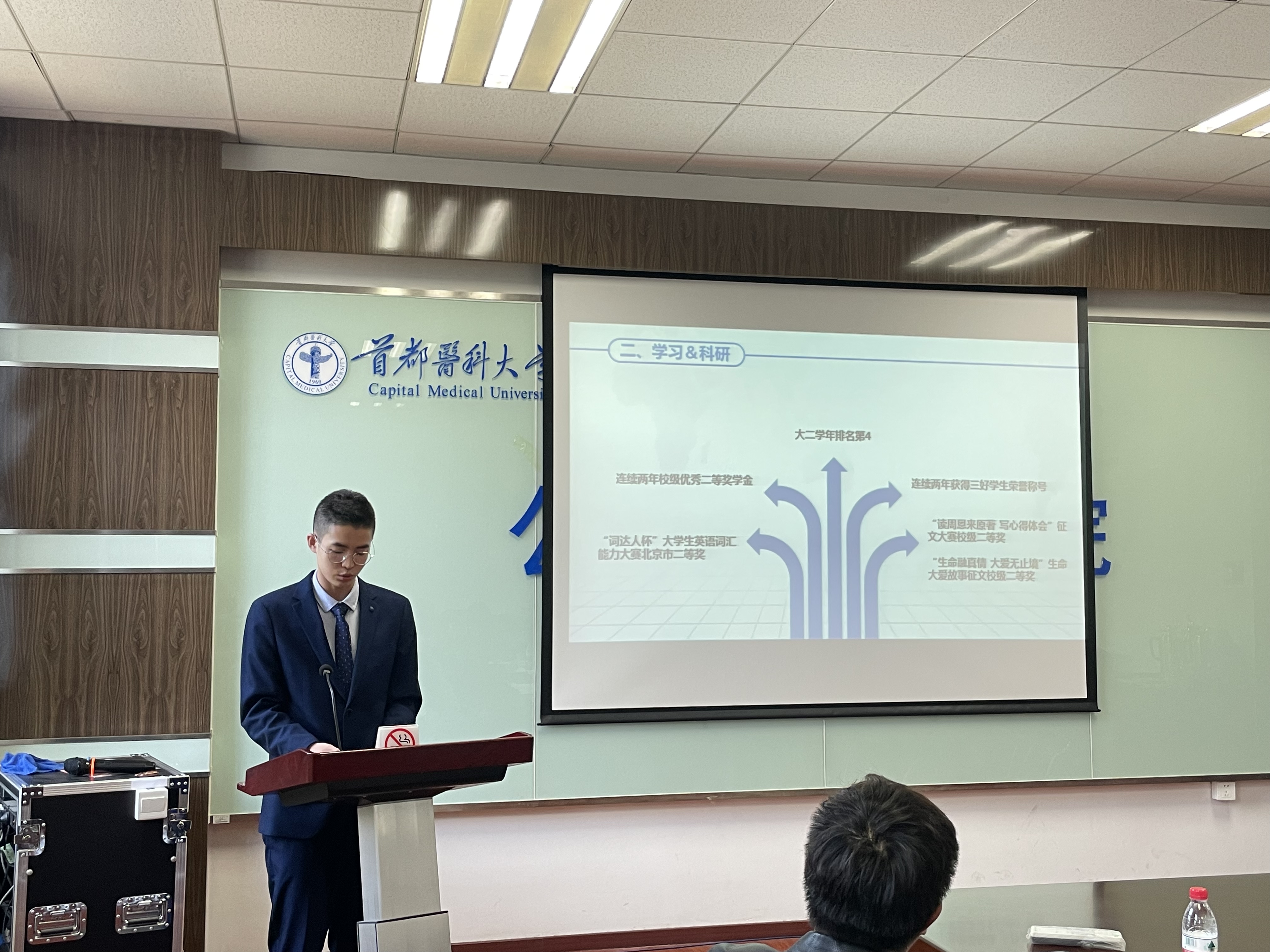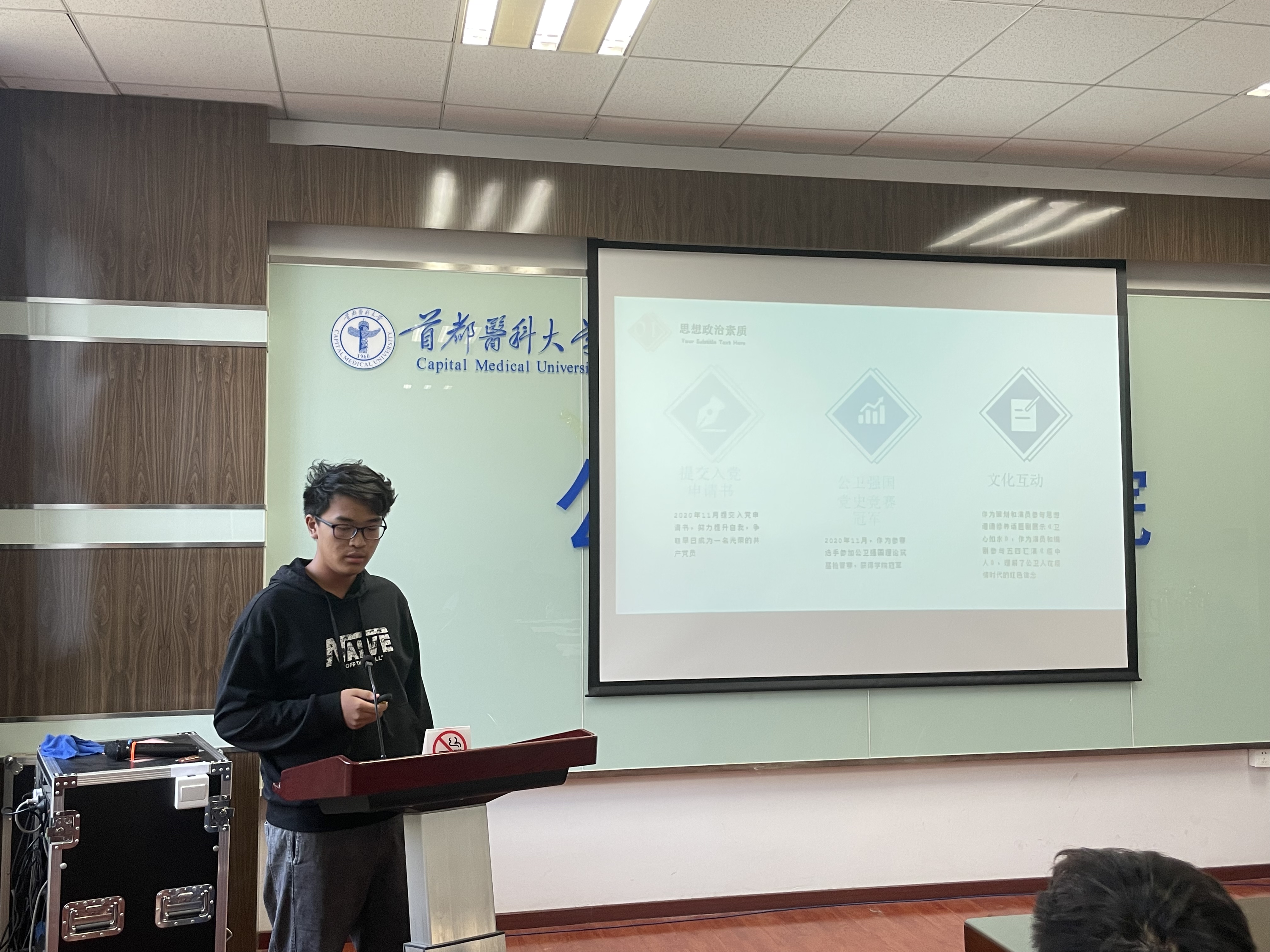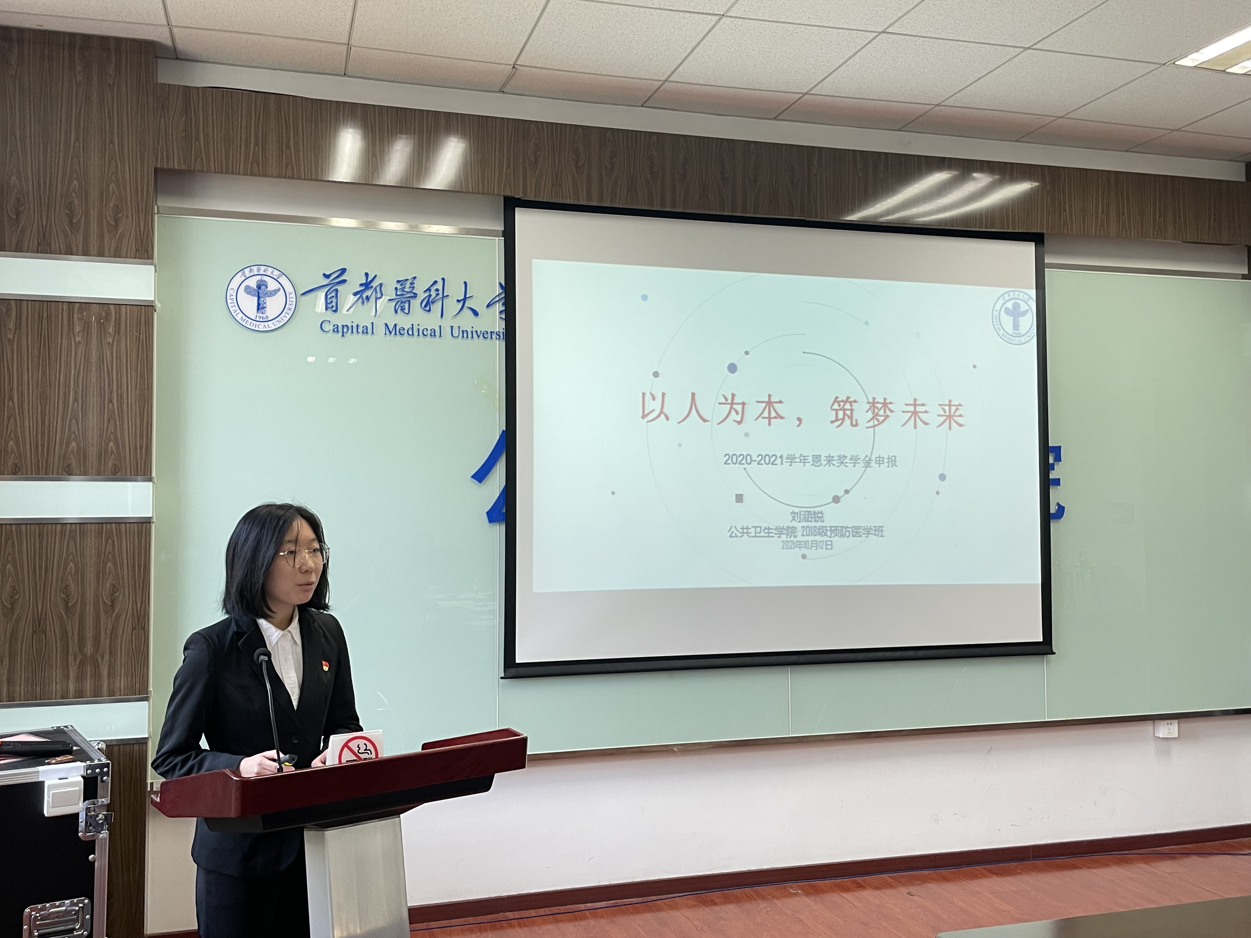 经过前期的班级申报和公司初审,共有6位候选人和2个班级入围今天的评审答辩环节。评审会由本科生党支部书记富奇主持。评审会伊始,主持人宣读评审要求和评分规则,并宣布恩来奖学金候选人名单,分别是金笑寒(2017级预防医学班)、刘涵锐(2018级预防医学班)、苏宇腾(2019级预防医学班)、李与涵(2019级卫生管理班)、李昊骏(2020级预防医学班)和谢佳鑫(2020级卫生管理班)。随后6位候选人按照抽签顺序依次进行答辩,从思想政治素质、学习科研情况、社会实践服务和年度获奖情况等各个方面进行个人展示,充分展现了公卫青年学子的昂扬风貌。